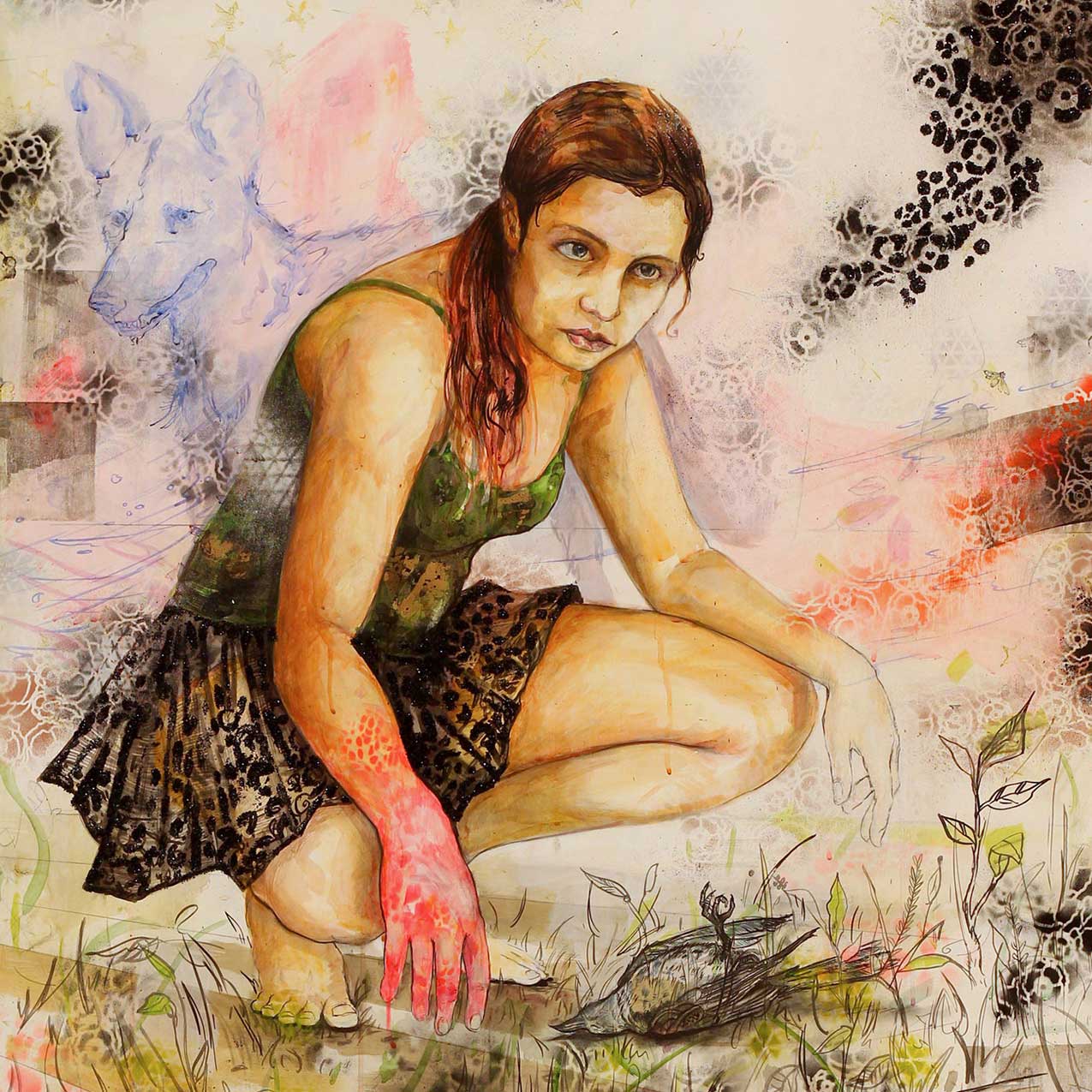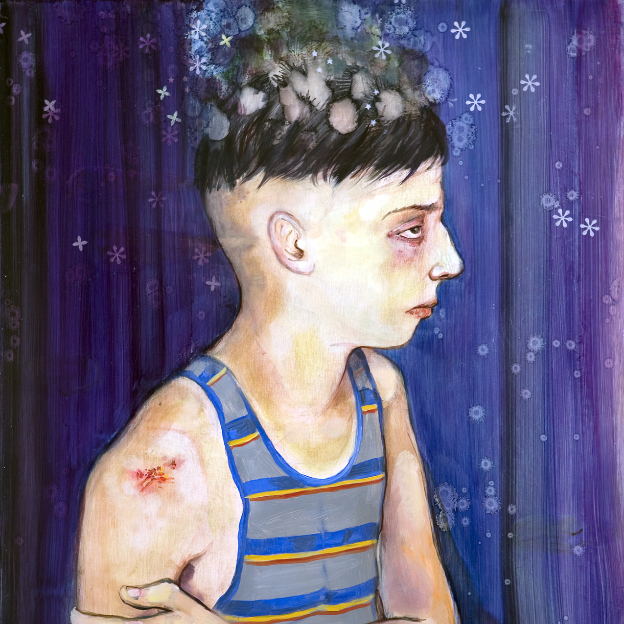 Drawing from magic realism and Latin American cultural references, Christian Curiel’s paintings create a vivid tableau depicting figures in moments that are at once dreamlike and real. Through vibrant colors and layered materials, he constructs rich narratives that explore the fragile space between dreaming and waking. Rooted in memory and adolescence, his work reflects the twin themes of belonging and identity, as he attempts to capture the complex psychic tension associated with a young person coming of age.